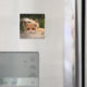 Um imã com uma fotografia de querido com uma pequena raposa laranja a espreitar por detrás de uma saída na natureza.