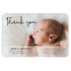 Personalizou este cartão magnético com fotografia de bebê, estatísticas de natalidade, nomes de pais e mensagem especial. Este design usa uma fonte elegante desenhada à mão para um toque de sofisticação para as palavras "obrigado você". Expresse sua entusiasmo de anunciar o nascimento do seu filho e envie sua gratidão ao mesmo tempo. A camada de transparência branca permite adicionar texto sem perder a legibilidade. Entre em contato comigo se precisar de assistência com este design. www.lddesignloft.com