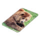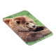 Urso grande, fofinho e com conteúdo marrom deitado na grama olhando para a câmera.
