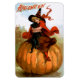 Um encantador e flexível ímã de Halloween, apresentando uma jovem bruxa sentada com seu gato preto sobre uma abóbora grande, pintada pelo ilustrador americano Frances Brundage.