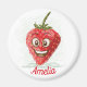 Uma imã de geladeira engraçada destacando um desenho de morango vermelho com uma cara engraçada rindo. Um modelo de nome vermelho correspondente aparece na parte inferior do plano de fundo. Um presente fácil de personalizar para pessoas que gostam de decoração de morango.