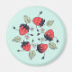 Íman de morango giro com uma ilustração vetorial que representa 5 caracteres de morango felizes sorridentes dançando num círculo rodeado por folhas e flores da sua própria espécie. Design divertida com espírito primavera para uma pessoa que ama essas frutas deliciosas.