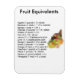 Fruta Equivalente Magnet. Um ímã de excelente para o seu frigorífico que contém informações úteis sobre equivalentes de comida. Quantos quilos de fruta você precisa cortar ou cortar? Quanto suco você vai conseguir? Você terá as respostas logo ali quando estiver cozinhar com este guia magnético prático bem ali na geladeira onde você pode encontrá-lo!