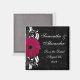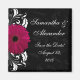 Coleção de correspondência elegante e elegante apresenta fundo preto com roldanas sutis, e um design de primeiro plano rodoso branco vívido com flor rosa brilhante da margarida gerbera, fuchsia magenta magenta gerbera. Muito elegante para um casamento no inverno, casamento de verão ou qualquer estação. Este item está disponível como uma coleção completa de correspondência, incluindo convites, cartões RSVP, Salvar Datas, Magnets, Stickers, Cartões de Local de Mesa, Planejamento de Casamento e Binders de Álbum de Fotografias, presentes de festa de casamento e Mais!