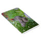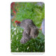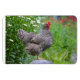 O nome desta galinha é Janet e ela está posando sobre um cogumelo de madeira esculpido.