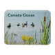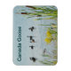 Uma pintura digital de gansos canadenses (Branta canadensis) nadando com cattails (Typha latifolia) e outra vegetação em primeiro plano. O texto personalizável que lê "Canada Goose" também é exibido.