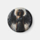 Este ímã apresenta arte em estilo impressionista de um anjo elegante, jovem e de pele escura com asas pretas, seus olhos voltados para baixo. Vestida com um vestido preto inspirado na Grécia com cinto dourado, ela irradia força tranquila e graça etérea. Seu cabelo natural texturizado é coroado com uma delicada coroa de louro dourada, simbolizando presença divina. O fundo mistura tons sombrios de carvão, marfim e dourados suaves, criando um contraste dramático que realça a energia celestial da figura.