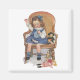 Ilustração de uma garota costurando bonecas enquanto se sentava em uma cadeira.
