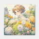 Flores em aquarela branca e amarela com uma linda garota de anime sentada dentro. Arte de IA.
