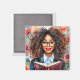 O ímã apresenta trabalho de arte de aquarela de uma linda negra com aspecto nerd, com cabelos grandes e naturais encaracolados vestindo óculos de pele preta e batom vermelho, segurando um livro contra seu peito com fundo botânico. A arte estética acadêmica floral, que inclui um estudante rico em melanina, um estudioso, um professor, um livreiro ou um bibliotecário da diáspora africana.
