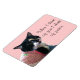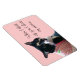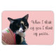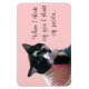 Foto de um gato branco e preto a vestir um vestido listrado rosa e branco, com um osso verde, com a mensagem, Quando penso em vocês, penso em paz, é impressa em ímãs flexíveis. A mensagem pode ser personalizada no formulário modelo.