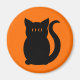 Íman redondo adorável para o Halloween ou qualquer dia com uma silhueta de gato preto sobre fundo laranja. Condecoração bonita e divertida para a geladeira. Ímanes de Halloween também fazem favoritos para festas bonitinhos e prêmios de porta.