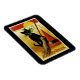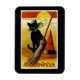 Vintage Halloween ilustra um cartão de saudação mostrando um gato preto, vassoura-de-bruxa e chapéu com o texto "Feiticeira Amigável ou Fay, preencha o desejo que deseja hoje."