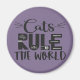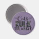 Imã de geladeira roxa divertida e adorável com as palavras "Gatos governam o mundo", decorada com bigodes brancos, arranhões de gatos, um ratinho minúsculo e uma pata.