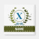 Uma delicada coroa de hera com um arco azul listrado é sobreposta a um fundo branco fresco. O design apropriado para casamento apresenta o monograma "X" em azul. O ímã pode ser personalizado com qualquer nome sobre a faixa de fita verde. Dica de design: Para a fonte mostrada aqui, use letras maiúsculas para o nome.