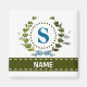 Uma delicada coroa de hera com um arco azul listrado é sobreposta a um fundo branco fresco. O design apropriado para casamento apresenta o monograma "S" em azul. O ímã pode ser personalizado com qualquer nome sobre a faixa de fita verde. Dica de design: Para a fonte mostrada aqui, use letras maiúsculas para o nome.