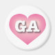 Este ímã apresenta um coração cor-de-rosa com um centro lavado em branco contendo as letras maiúsculas, maiúsculas e em negrito GA, a abreviação oficial para Georgia, o estado de pêssego.