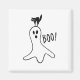 Um imã fantasma fofo e assustador! Um fantasma bonito diz "Boo!" enquanto um gato preto está empoleirado na sua cabeça. Gráficos pretos.