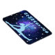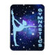 Galaxy Gymnastics design com estrelas brancas, forma leitosa, silhueta de ginástica feminina azul de pó claro e diz ginástica em forma vertical.