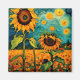 A.I. criou a interpretação de uma paisagem de dois grandes girassóis, erguidos entre um campo de flores laranja e vermelha, contra um céu azul giratório, pontilhado com o sol e as estrelas.