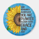 Bonito girassol amarelo desenhado com fundo colorido. Citação inspiradora. Lembre-se de onde quer que esteja plantado para florescer com amor e graça.