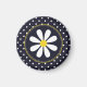 Um ímã redondo com uma flor de margarida giramente retrô no topo com margaridas brancas com centros amarelos contra fundo azul marinho, e um padrão de bolinhas azul e branco de tendência no exterior.