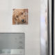 Um adorável Goldendoodle, de onze semanas, com olhos brilhantes, curiosamente sai de uma porta em um muro de tijolos