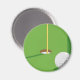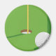 Ilustração de um verde de golfe com o buraco no chão e uma bola de golfe pronta para entrar. Imagem disponível em vários presentes e produtos. Ímãs.