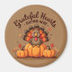 This charming Thanksgiving design features an adorable cartoon turkey with vibrant orange, red, and brown tail feathers perched atop a trio of plump pumpkins. Surrounded by whimsical falling hearts, autumn leaves, and warm seasonal colors, the artwork is framed by the joyful phrase “Grateful Hearts Gather Here” in bold, playful lettering. The illustration radiates a cozy, festive vibe perfect for celebrating gratitude, family, and togetherness during the fall season. Its cheerful and heartwarming aesthetic makes it ideal for spreading seasonal joy and capturing the magic of Thanksgiving gatherings. Whether displayed in a home setting or shared as a thoughtful seasonal gesture, this playful composition adds a lighthearted, seasonal charm. AI generated artwork.
