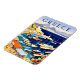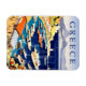 Grécia. Barcos no porto e pequeno mercado no promenade do mar. Viagens vintage de poster num ímã.