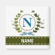 Uma delicada grinalda de hera com um laço listrado azul é sobreposta a um fundo branco fresco. O design apropriado para casamento apresenta o monograma "N" em azul. O ímã pode ser personalizado com qualquer nome sobre a faixa de fita verde. Dica de design: Para a fonte mostrada aqui, use letras maiúsculas para o nome.