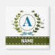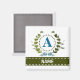 Uma grinalda de hera delicada com um laço azul listrado é sobreposta a um fundo branco fresco. O design apropriado para casamento apresenta o monograma "A" em azul. O ímã pode ser personalizado com qualquer nome sobre a faixa de fita verde. Dica de design: Para a fonte mostrada aqui, use letras maiúsculas para o nome.