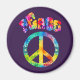 Íman retrô redondo da dos anos 70 apresenta um sinal de paz de corante de gravata ranhosa com texto curvo sobre fundo vermelho escuro