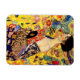 Magnet com pintura de óleo de Gustav Klimt Lady com ventilador (1918). Uma mulher vestindo um quimono azul segura um fã vermelho contra um fundo amarelo colorido de flores e pavões. Um presente de excelente para fãs de arte japonesa e europeia.