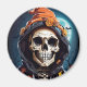 Um imã com uma ilustração de um esqueleto vestindo uma jaqueta encapuzada com um chapéu de bruxa laranja no topo. Uma lua brilhando nas costas com um morcego solteiro voando perto. Design de Halloween de outono divertido.