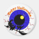 Olho humorístico com o reflexo da lua e das estrelas, e uma bruxa voadora com um gato preto assustador numa vassoura para o Halloween.