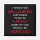 Esta design mostra um ditado "Eu acho que para o Halloween eu vou como Karma alguns de vocês deveriam estar preocupados". Escrito em uma popular tipografia vermelha e branca. #halloween #karma #engraçado #sayings #cozinha #feriados