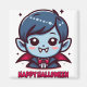 Ce design présente un charmant petit vampire aux traits stylisés et enfantins, parfait pour célébrer l’esprit d’Halloween. Le personnage arbore une peau bleutée avec des nuances subtiles et des joues rosées, évoquant une innocence juvénile. Ses yeux grands et expressifs sont accompagnés de petites étoiles scintillantes, ajoutant une touche magique à l’ensemble. La coiffure du vampire est d’un bleu profond avec des reflets plus clairs, ce qui crée un contraste agréable avec le teint de sa peau. Il porte un costume classique de vampire composé d’une cape rouge vif doublée de noir et d’un nœud papillon rouge à pois blancs, ce qui lui donne un air à la fois élégant et festif. Les canines proéminentes du sourire espiègle rappellent son identité vampirique tout en conservant une allure adorable et accessible. Le texte “Happy Halloween” en lettres arrondies et amicales surplombe le personnage, renforçant le thème festif avec une typographie qui évoque la convivialité et la joie des célébrations d’Halloween.