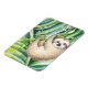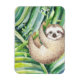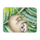 Íman flexível de geladeira branca com ilustração aquosa de preguiça feliz pendurada no galho com grandes folhas azuis e verdes tropicais de fundo