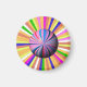 Bold, colorful stripes create a lively and uplifting background, while a matching striped sphere sits at the center like a playful focal point.