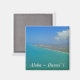 O ímã do Havaí mostra uma visão aérea da costa havaiana. Oceano e areia se encontram nesta foto. Este ímã de souvenir também tem a saudação tradicional de aloha.
