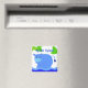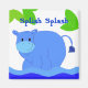 Um hipopótamo azul legal a saltar na água azul legal. Folhas verdes e brilhantes acima dele. Um ímã hippo divertido.