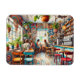 Presente perfeito para o amante de viagem e café. A pintura aquarela captura o charme vibrante e eclético de um pequeno compro de café hippy em Miami. Placas pintadas de forma brilhante em vermelhos, azuis e amarelos cercam mesas com padrão mosaico, enquanto murais de flores tropicais, símbolos de paz e arte abstrato adornam as paredes. O contador de madeira recuperado é enfeitado com potes orgânicos, cestos de fruta fresca e uma máquina de café expresso. Prendendo planadores macramé com verde-luxuoso adiciona um toque natural, complementado por luzes coloridas de cordas batendo sobre o teto, lançando um brilho confortável e quente. Patrões em café casual, inspirado na praia, feito a partir de canecas de cerâmica feitas à mão, alguns conversando animadamente enquanto outros esboçam em revistas. A luz do sol suave que passa por grandes janelas se mistura harmoniosamente com o interior colorido, refletindo a vibração relaxada e artística do café.