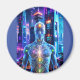 Uma forma humana brilhando se coloca num pano de fundo dos arranha-céus futuristas, com cores vibrantes e pontos de energia iluminando várias partes do corpo. A paisagem urbana de alta tecnologia reflete as luzes de néon, criando uma atmosfera dinâmica e energética. Digital Art Photoshop CS5