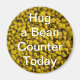O botão para contadores diz "Hug a Bean Counter Today." em letras brancas sobre um fundo de feijão amarelo. Quem disse que contadores não têm senso de humor? Bonito presente para o seu encantador de números favorito.