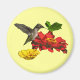 Este ímã apresenta uma fêmea de beija-flor-garganta arruinada. Ela paira no ar enquanto o néctar do bebendo do centro ouro de uma flor vermelha brilhante da zínnia. Uma flor amarela da zínnia está por perto e algumas folhas verdes completam a composição. As cores parecem brilhar contra o fundo amarelo pálido.