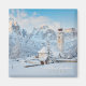 Imagem fotográfica com a igreja de Colfosco coberta de neve com o fundo das montanhas do Grupo Sella Dolomites numa bela paisagem de inverno em Alta Badia, Tirol do Sul, Itália com o texto 'Alta Badia, Itália'.