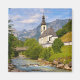 Fotografia de Souvenir com uma paisagem com uma igreja ao lado de um riacho montanhoso, com no fundo montanhas dos Alpes, num dia de verão, em Ramsau bei Berchtesgaden, na Baviera, Alemanha, ao lado da fronteira com a Áustria.