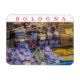 Uma bela fotografia de uma comida de janela de compro na cidade de Bolonha, na Itália, impressa numa imã de geladeira de souvenir.