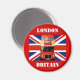 Imã de geladeira de Souvenir, de Inglaterra/Londres, com bandeira britânica e um icônico ônibus vermelho de dois andares em Londres. O mesmo design também está disponível como Cartões de Saudação, Cartões Postais, Crachás, Magnets, Stickers, T-Shirts, Chapéus, Aprons, Anéis-Chave.